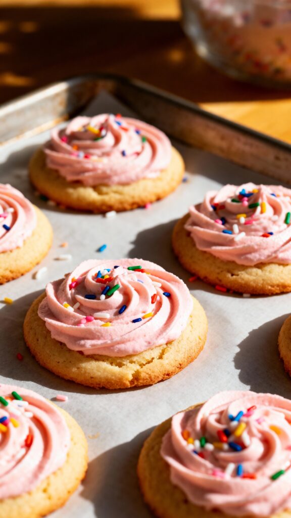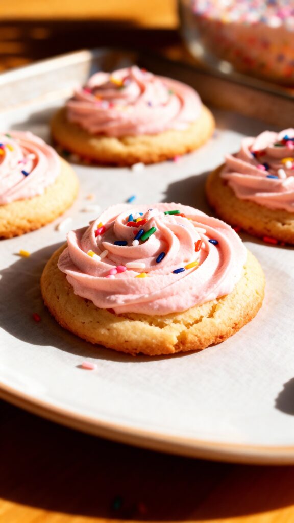 These soft, cakey sugar cookies with swirled frosting are a homemade version of the pink-frosted cookies you find in grocery store bakeries.