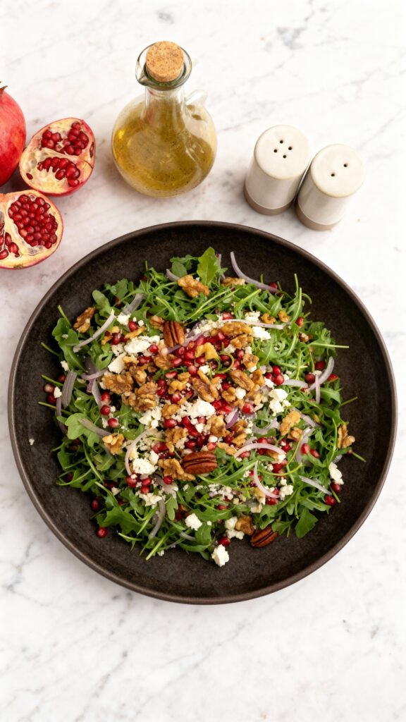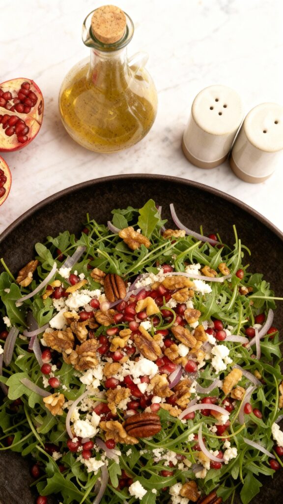 This vibrant salad combines peppery greens, juicy pomegranate seeds, creamy feta, and crunchy candied pecans with a bright citrus vinaigrette.