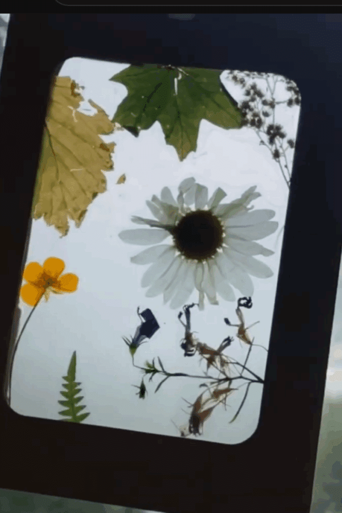 You get a flat, translucent panel with colorful bits of nature trapped inside. When you hold it up to the sun (or hang it in a car or tent window), it makes a simple sun catcher.
