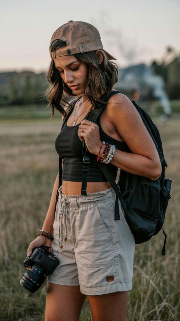 This outfit nails the effortlessly outdoorsy vibe with just enough edge. A cropped tank and wide-leg pants feel breezy and cool for camp days, while classic Vans make you look like you might bust out a skateboard mid-s’mores. Low-key iconic. 🛹🌿