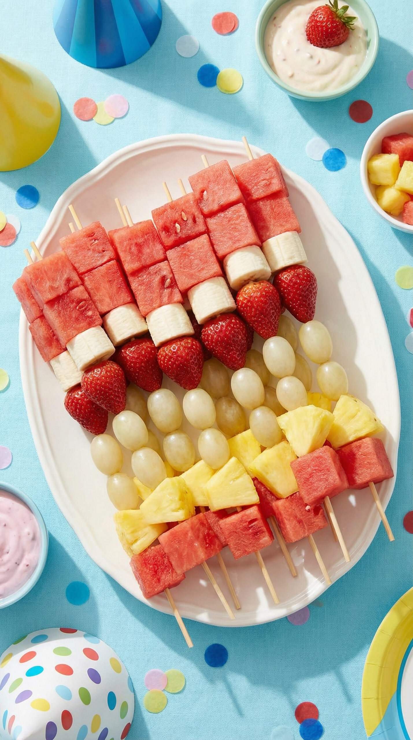 These fruit kabobs stack alternating red and white fruit to recreate the Cat in the Hat’s iconic striped hat. They are a healthy option for Dr. Seuss parties that kids will actually want to eat.