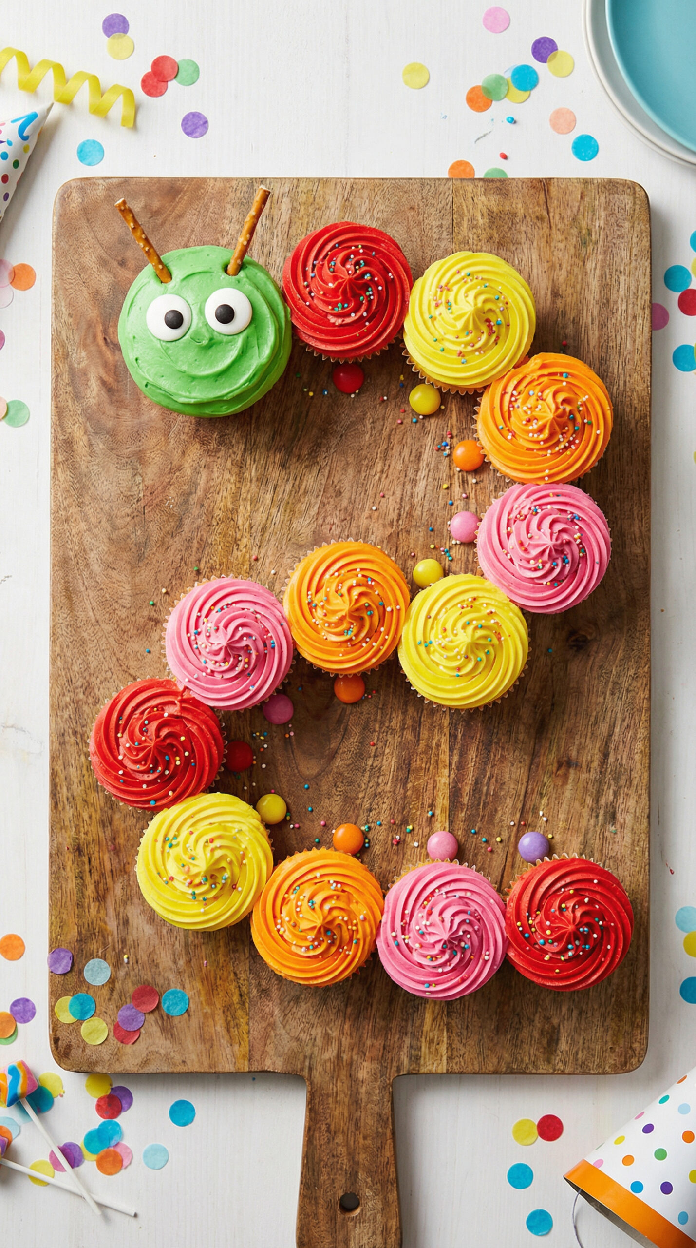 Assembly timing: Frost and assemble the caterpillar 2-4 hours before the party — the frosting holds up fine at room temperature for that long.