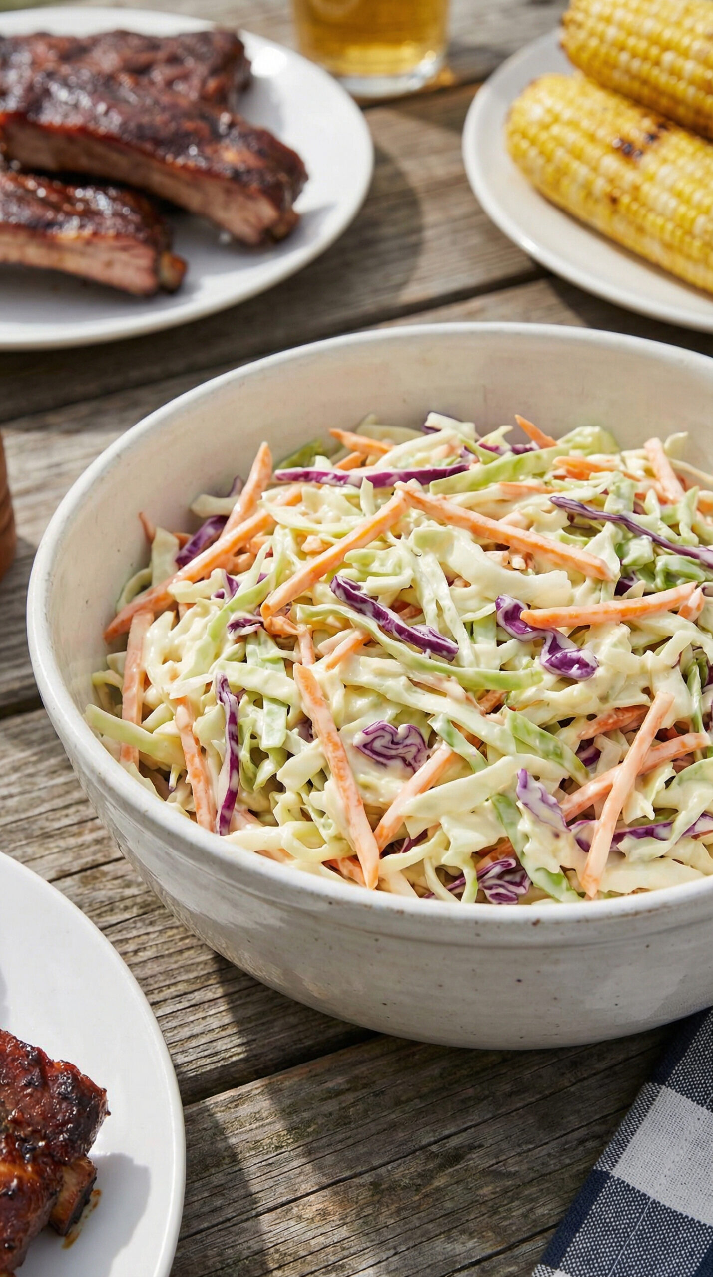 The rest time matters. Coleslaw improves significantly after an hour in the refrigerator — the dressing softens the cabbage and the flavors come together.