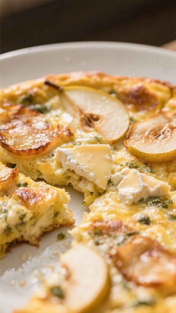 For a sweet-meets-savory brunch dish, caramelize sliced pears and fold them into a creamy brie base. It’s basically cheese board vibes in frittata form.
