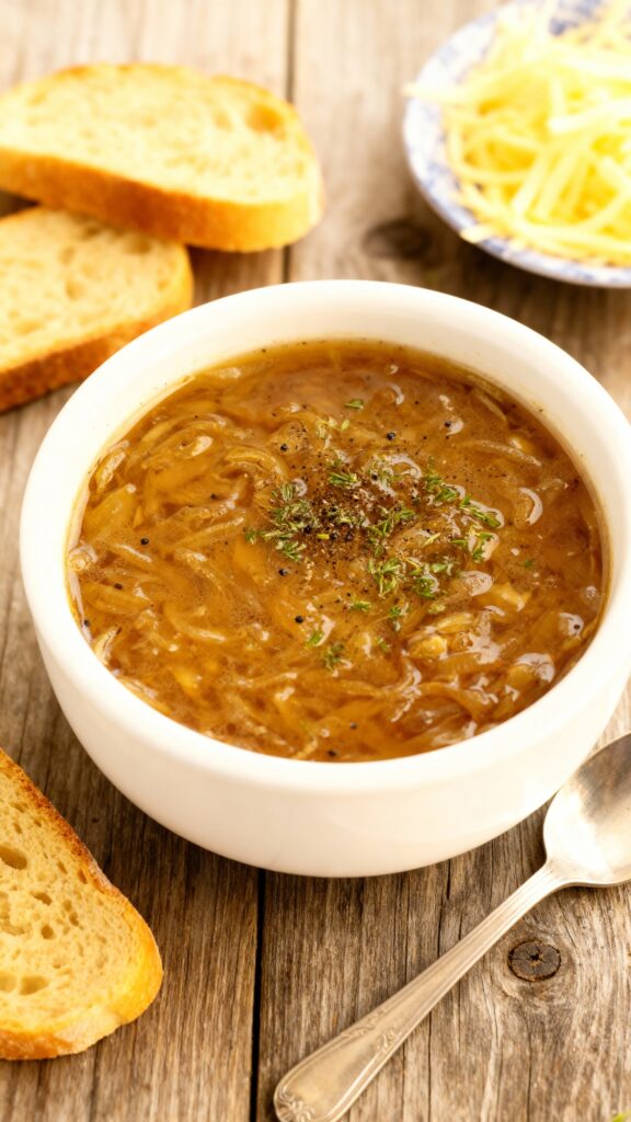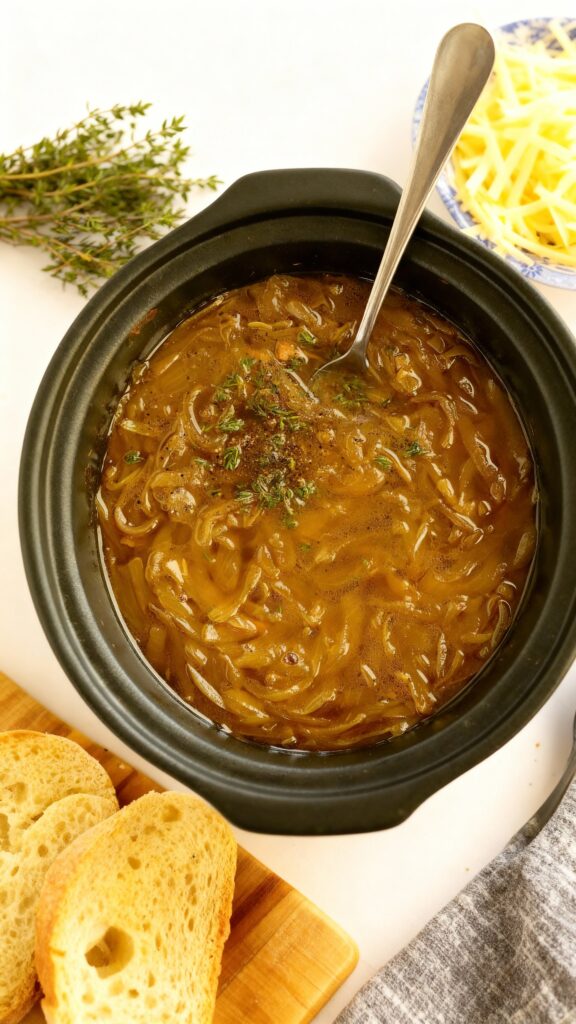 Rich, deeply caramelized onions simmered in a flavorful beef broth with thyme, garlic, and a splash of wine — all topped with crusty bread and melted Gruyère. This slow cooker version gives you the same depth as the stove-top classic but without the constant stirring.