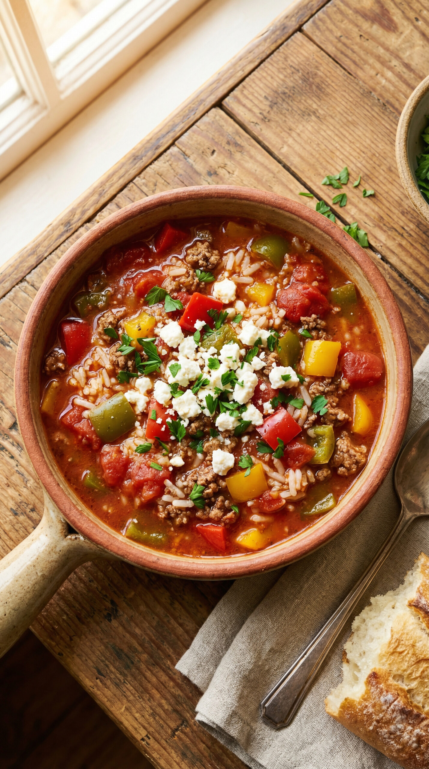 Crockpot Greek Ground Beef & Rice Stuffed Pepper Soup