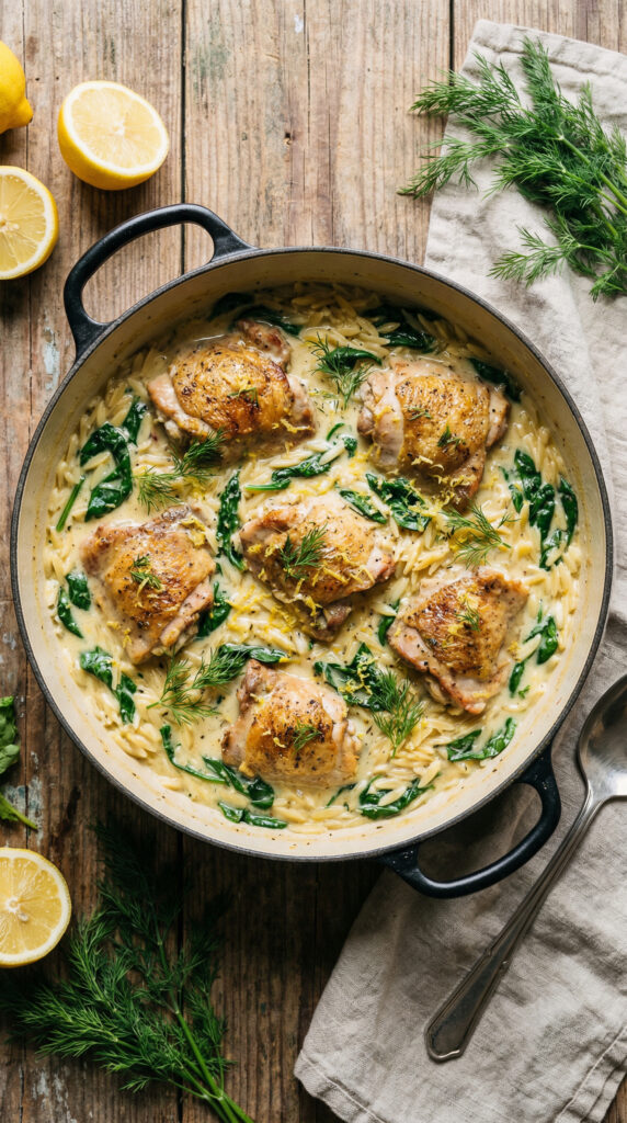 The orzo cooks like risotto—in broth with the chicken—so everything builds flavor together.