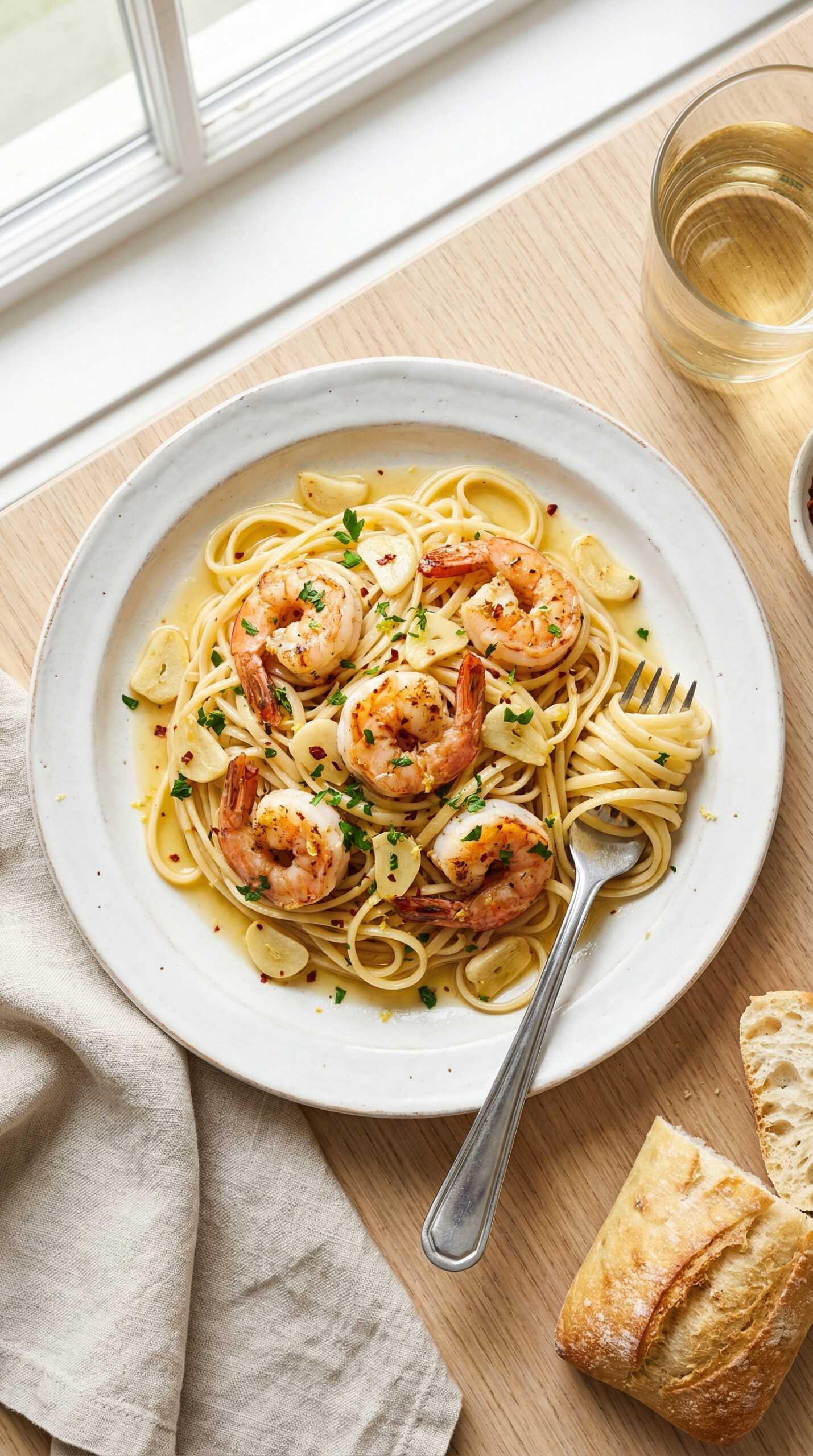 You can slice the garlic, juice the lemon, and peel the shrimp a few hours ahead.