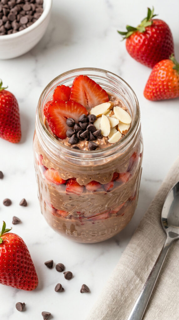 Strawberry chocolate overnight oats are the same concept but with cocoa powder whisked into the base and a layer of diced strawberries in the middle. It’s a chocolate-covered-strawberry situation in oat form. Slightly more indulgent, still has the Greek yogurt protein base, still takes five minutes to put together.