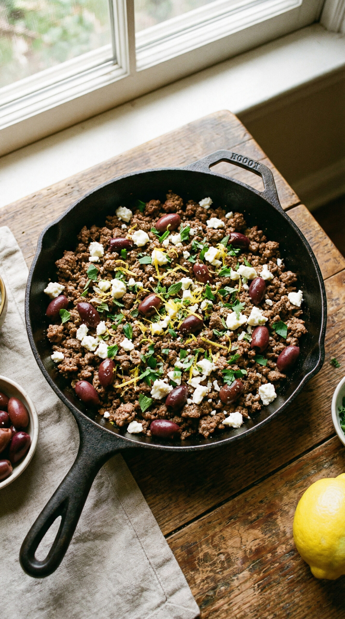 Ground beef with Greek flavors—oregano, lemon, kalamata olives, and a heap of feta—all built in one skillet in 15 minutes.