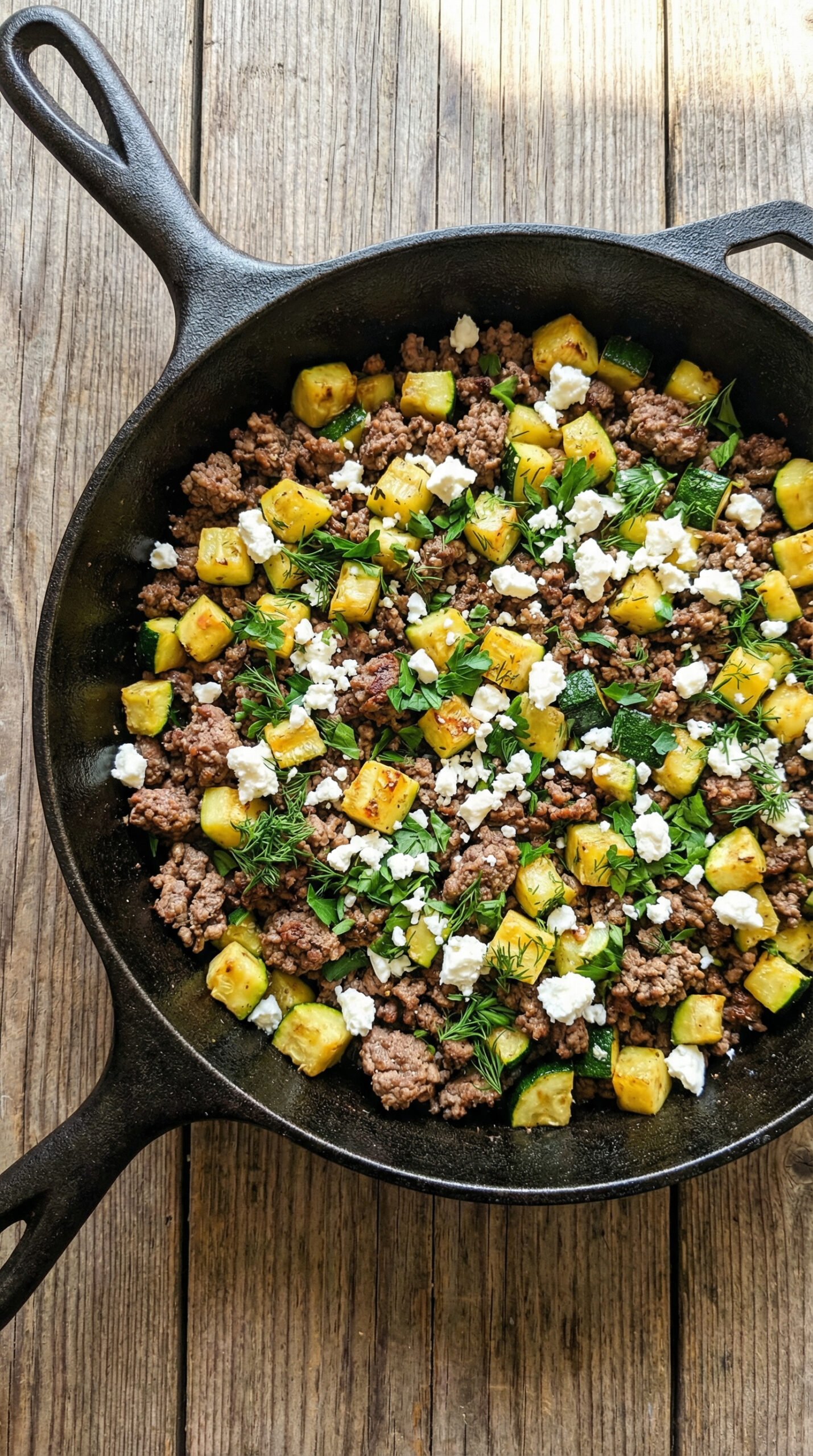 Diced zucchini and ground beef in one skillet, seasoned with garlic and oregano, finished with crumbled feta.