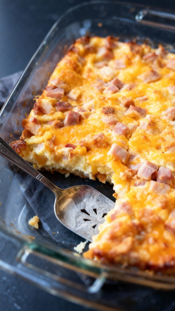 This savory breakfast casserole combines cubed ham, melty cheese, and fluffy eggs in one easy dish.