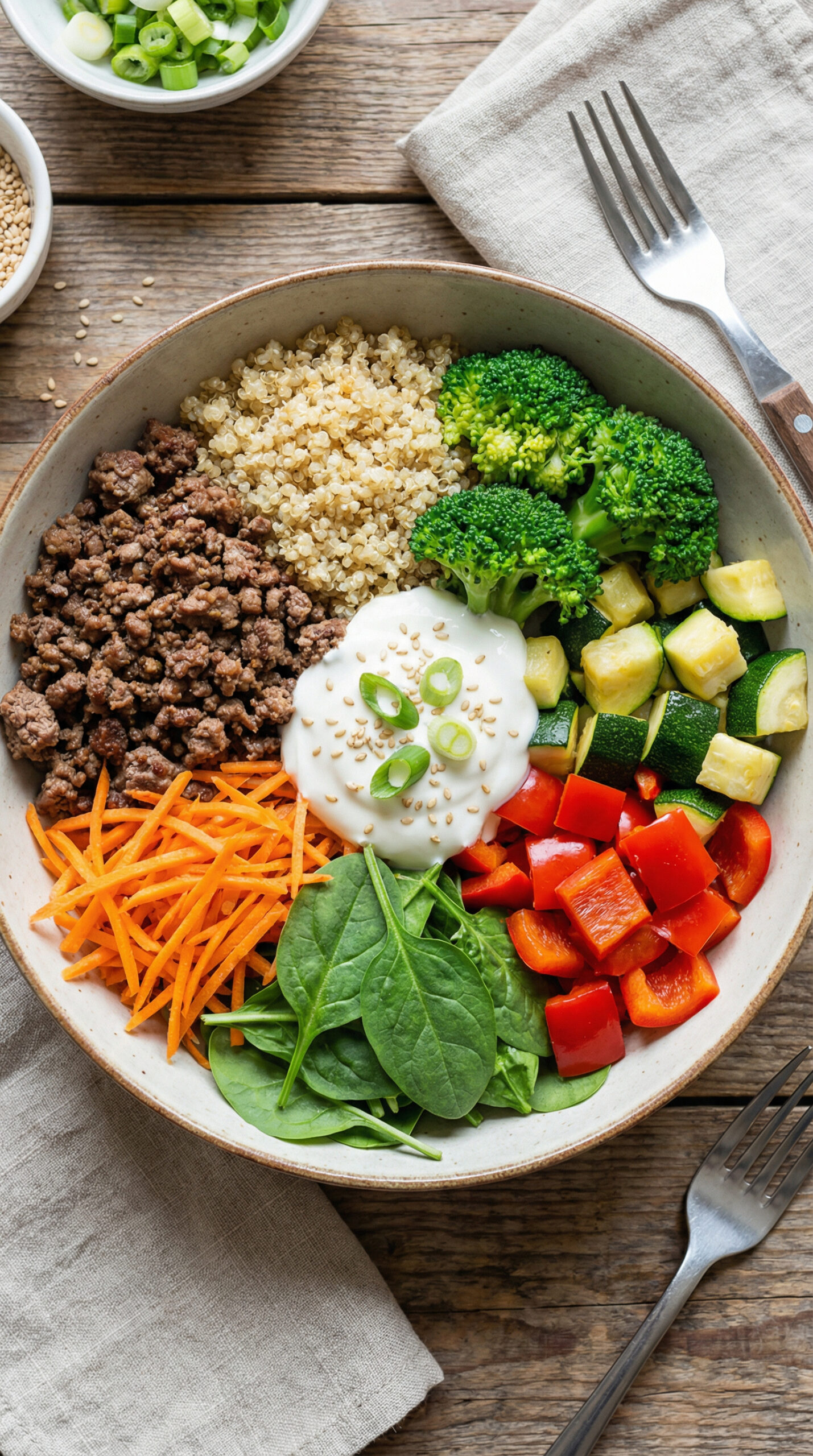 Quinoa provides complete amino acids alongside ground beef, making this a genuinely high-protein pairing rather than a carb-heavy grain bowl that just happens to have some meat on top.