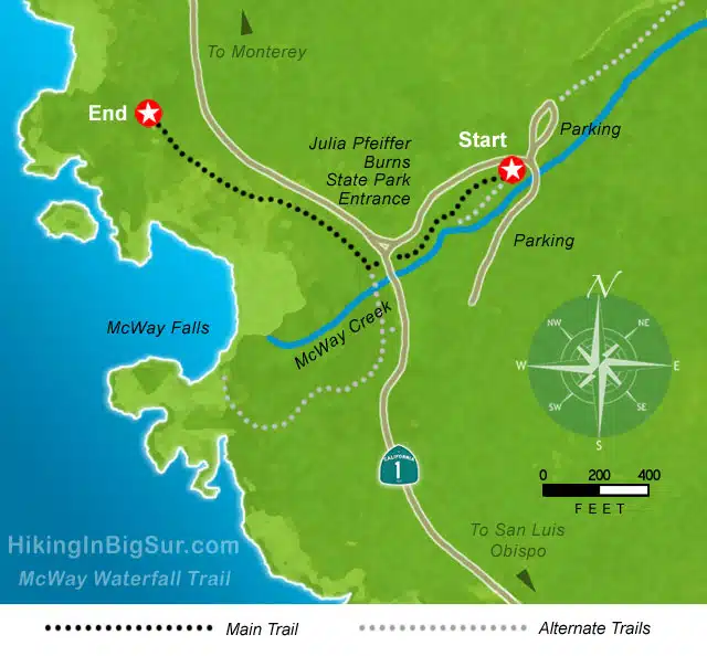 Julia Pfeiffer Burns State Park, which spans across 3,762 acres, is well marked and easy to