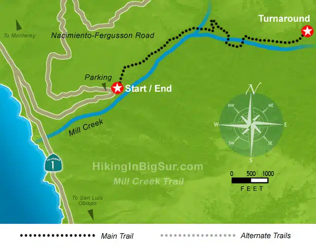 Note: this Mill Creek Trail is not to be confused with another trail by the same name at the northern edge of Big Sur.