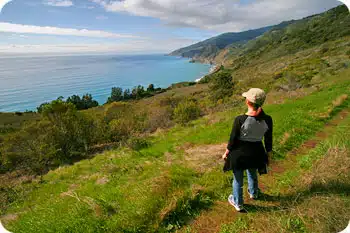 An all-day workout or modest up and back that indulges the senses with vast ocean, mountain and canyon panoramas in addition to redwood, bay tree and oak forests.