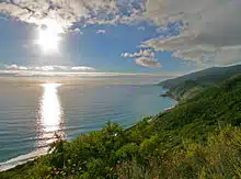The first couple miles skirt along the side of the mountains overlooking the ocean, and alternate between stretches of dense coastal brush and more open grassy areas. The rocky trail is a little rough in spots, but passable all the way through.