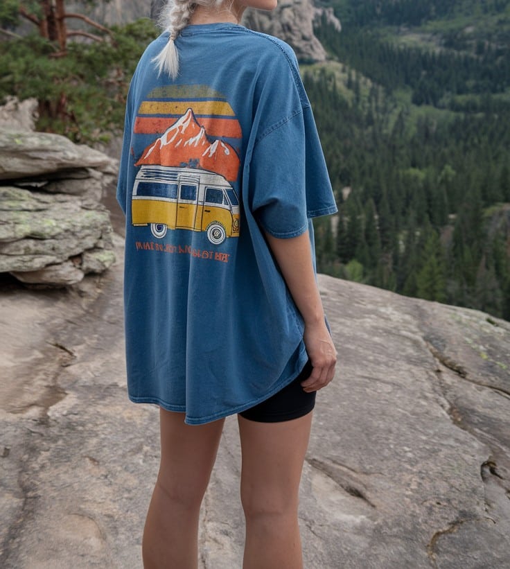 Big tee energy meets trail-ready comfort. This easy combo is perfect for laid-back hikes or trailhead hangs—bonus points if your shirt’s got retro vibes and a story to tell. 🚌🌄