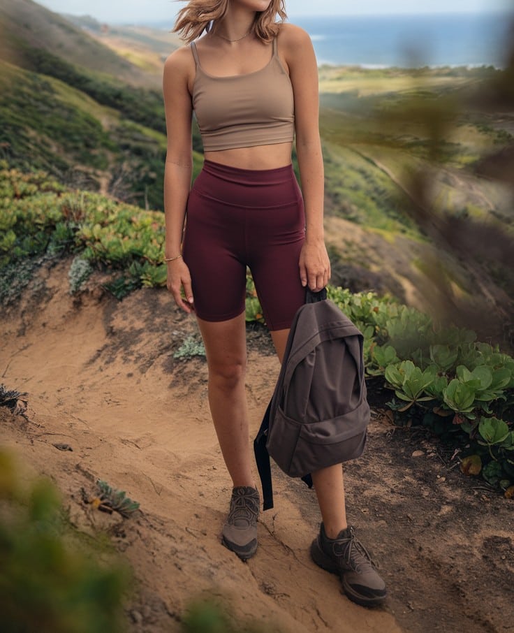This look is made for sunrise trailheads and golden hour summit shots. The cropped athletic top keeps things cool and sculpted, while the running shorts let your legs breathe (and move). High-cut boots mean you’re ready for rocky climbs, loose gravel, or that surprise detour to the ridge. ☀️🏔️