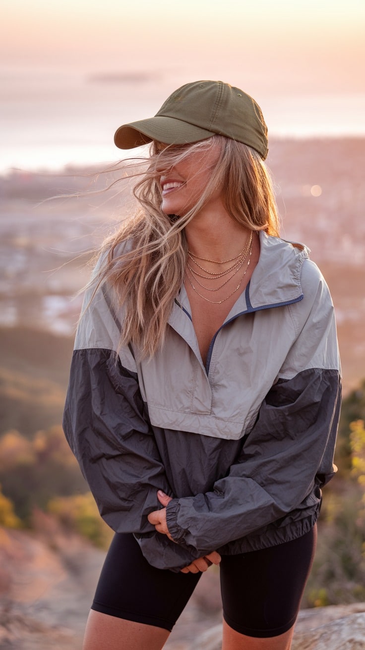 3. Windbreaker + Biker Shorts + Baseball Cap