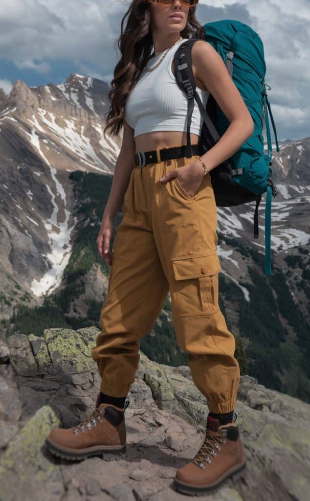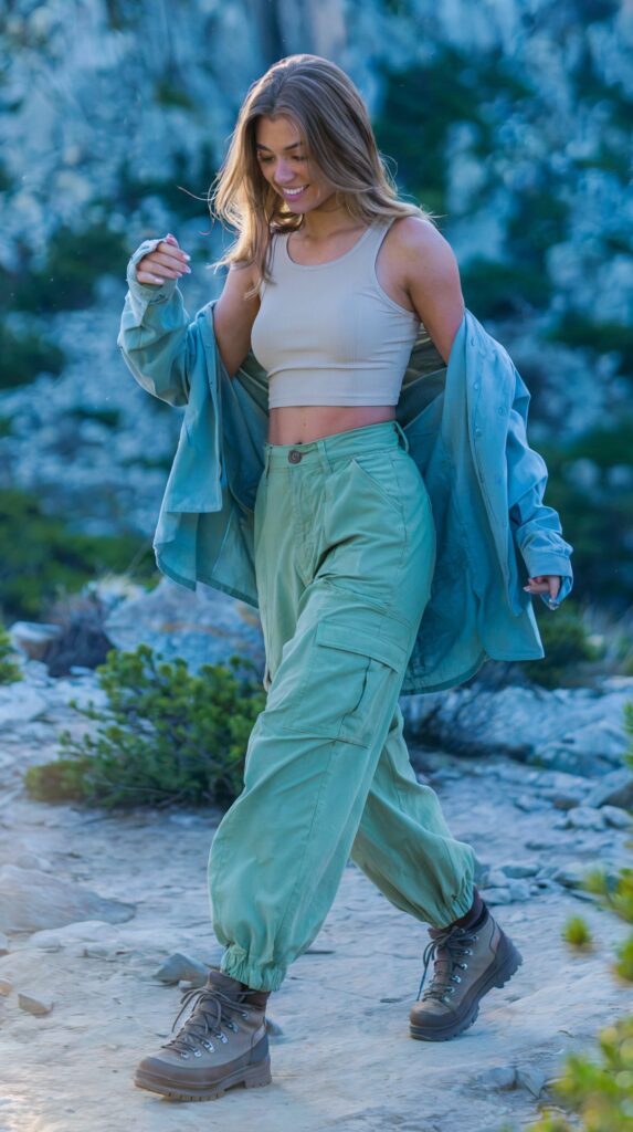 This look nails that breezy-summer-hiker vibe. The crop tank keeps you cool when the sun’s out, while the cargo pants are made for trail snacks, maps, and unexpected adventures. Toss on a lightweight shirt for coverage without the sweat. Effortless, functional, and seriously cute. 🏞️🌤️