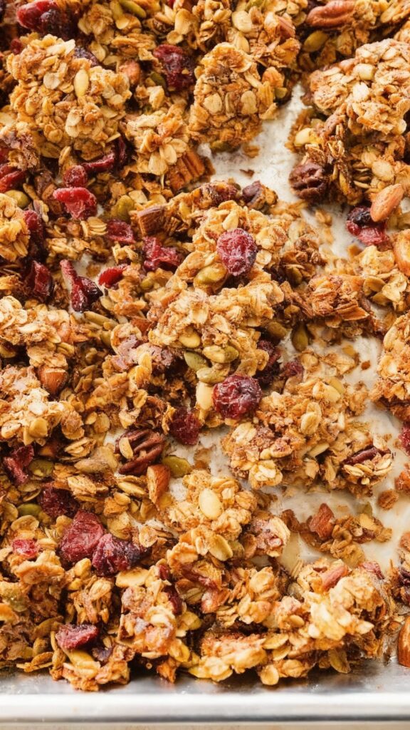 Savory granola is worth trying. Skip the sweetener and vanilla entirely. Use olive oil, add fresh rosemary, black pepper, grated parmesan, and a mix of nuts and seeds. Bake the same way. Serve over salad or a bowl of soup instead of bread. It’s not what most people expect granola to be and it’s genuinely good enough to make people ask what it is.