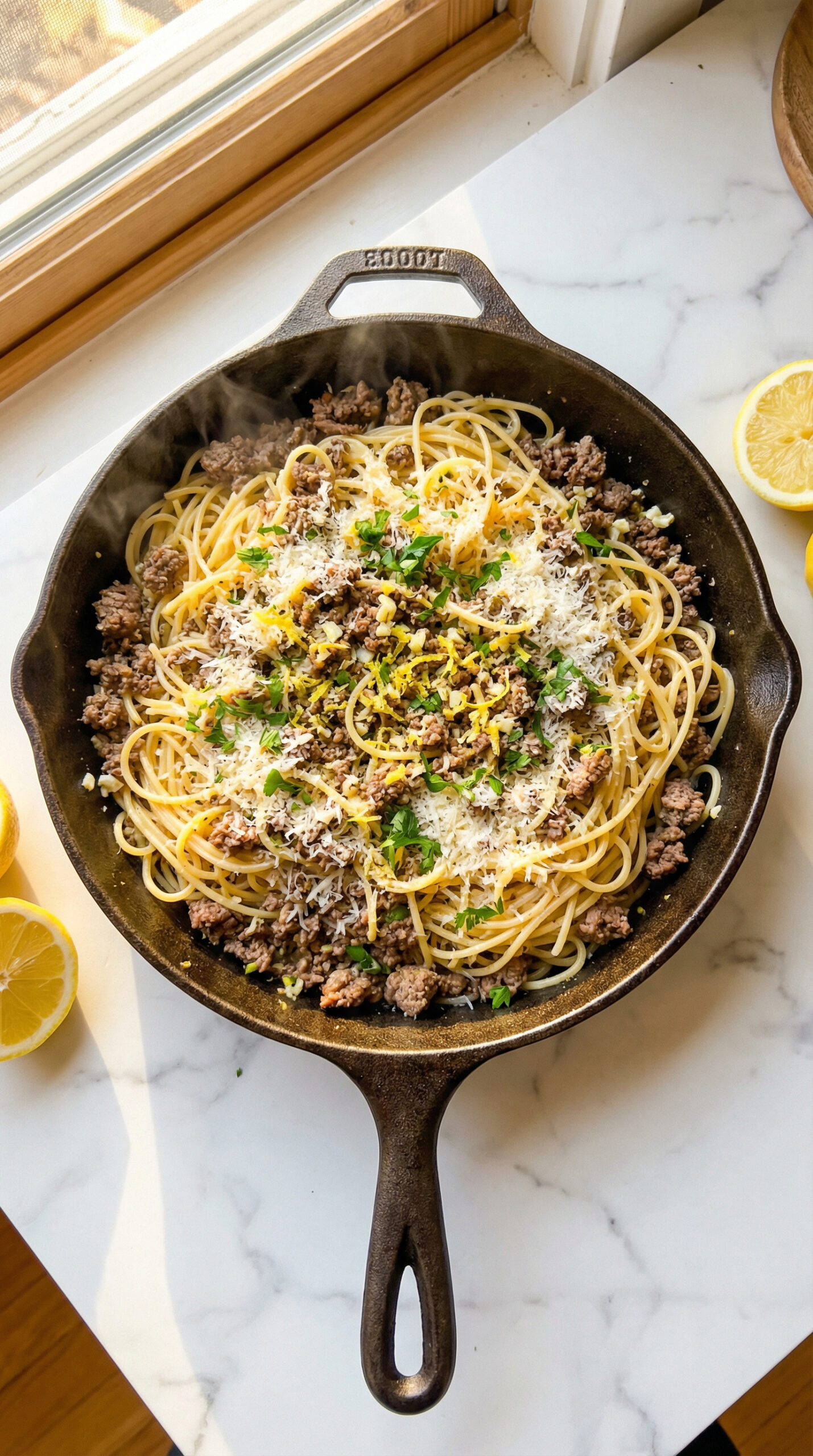 This is bright, fast pasta with ground beef and tons of garlic, finished with lemon juice and zest instead of tomato sauce.