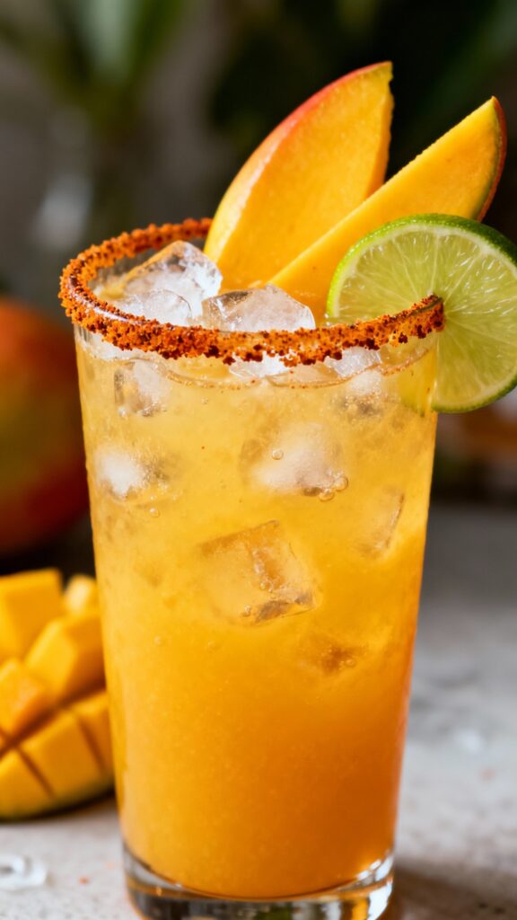 For a party, set up a DIY garnish station with mango slices, lime wheels, Tajín, and chamoy so guests can customize their drinks.