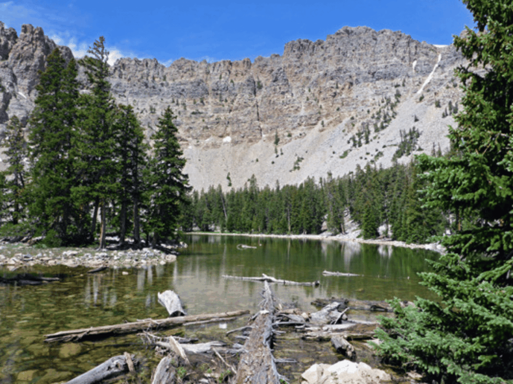 The 12-mile round-trip hike climbs through bristlecone pine forest, some of the oldest living trees on Earth, to an alpine lake beneath Wheeler Peak.