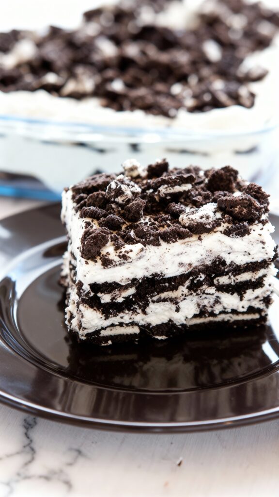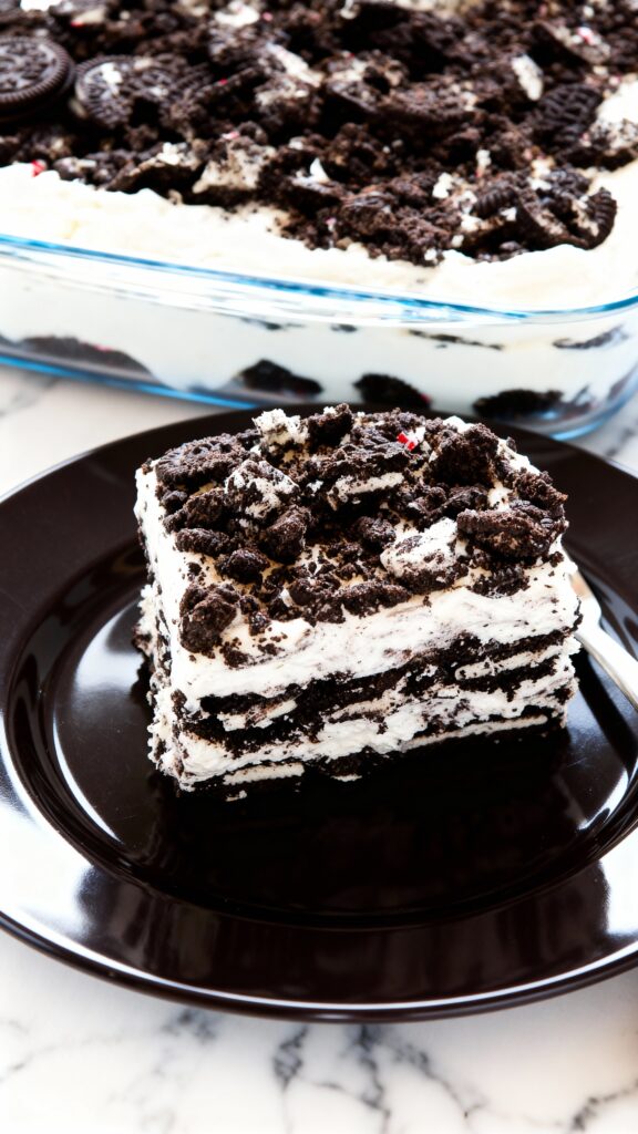 This no-bake dessert layers chocolate Oreos with peppermint whipped cream that softens into a cake-like texture as it chills.