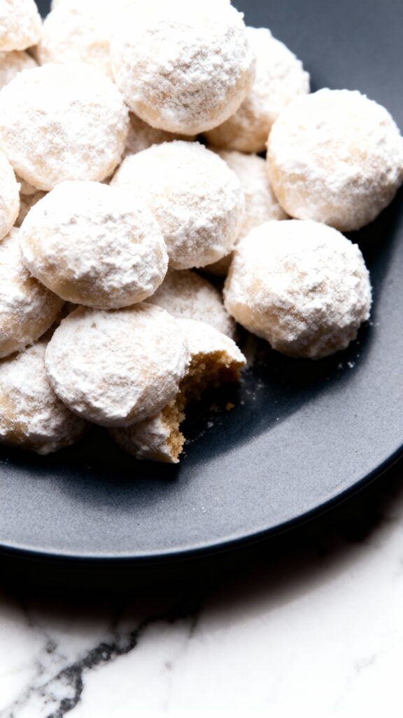 For almond snowballs, swap the pecans for almonds and use almond extract instead of vanilla.