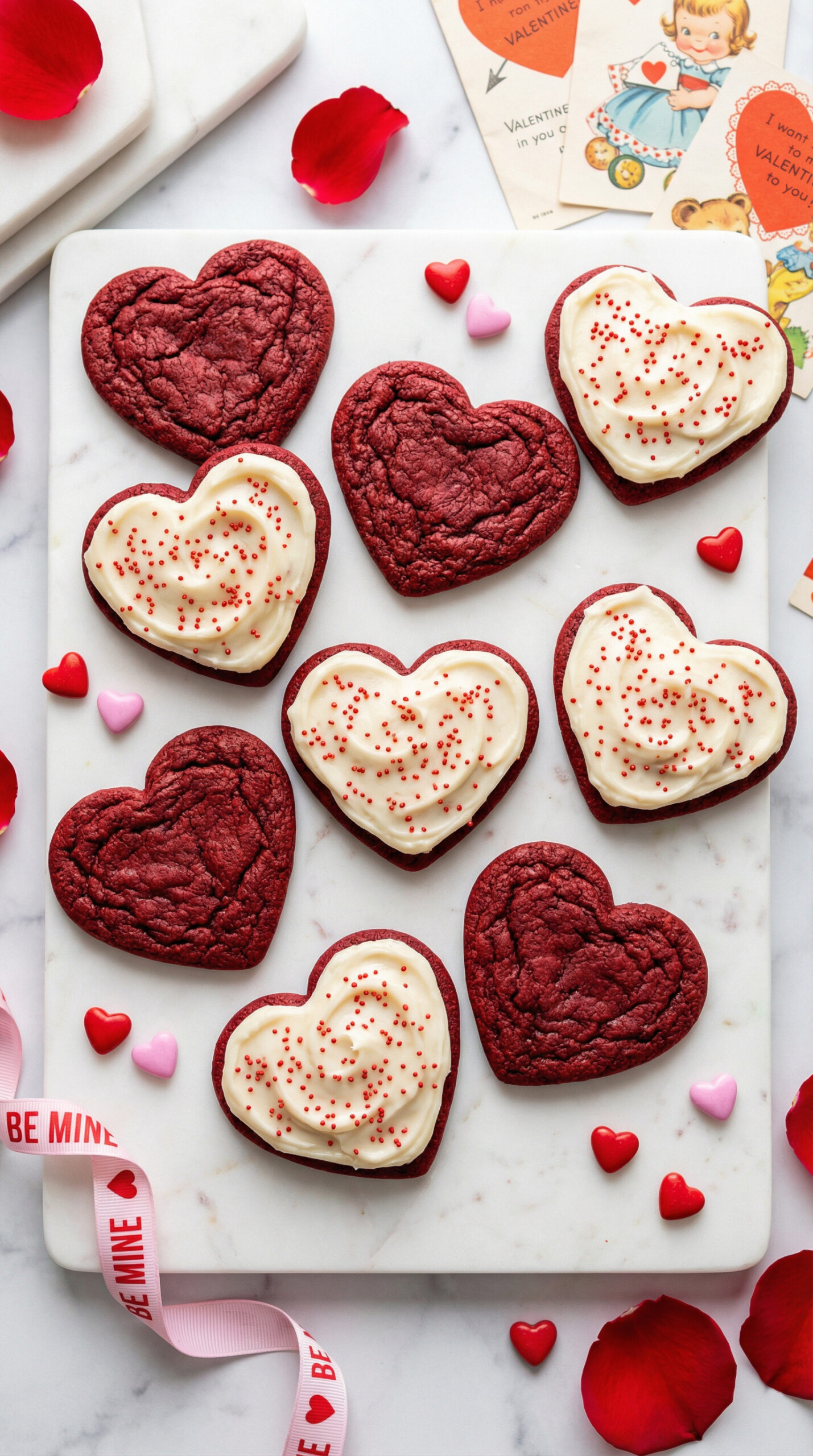 Soft, slightly tangy cookies with true red velvet flavor, cut into heart shapes and topped with cream cheese frosting.