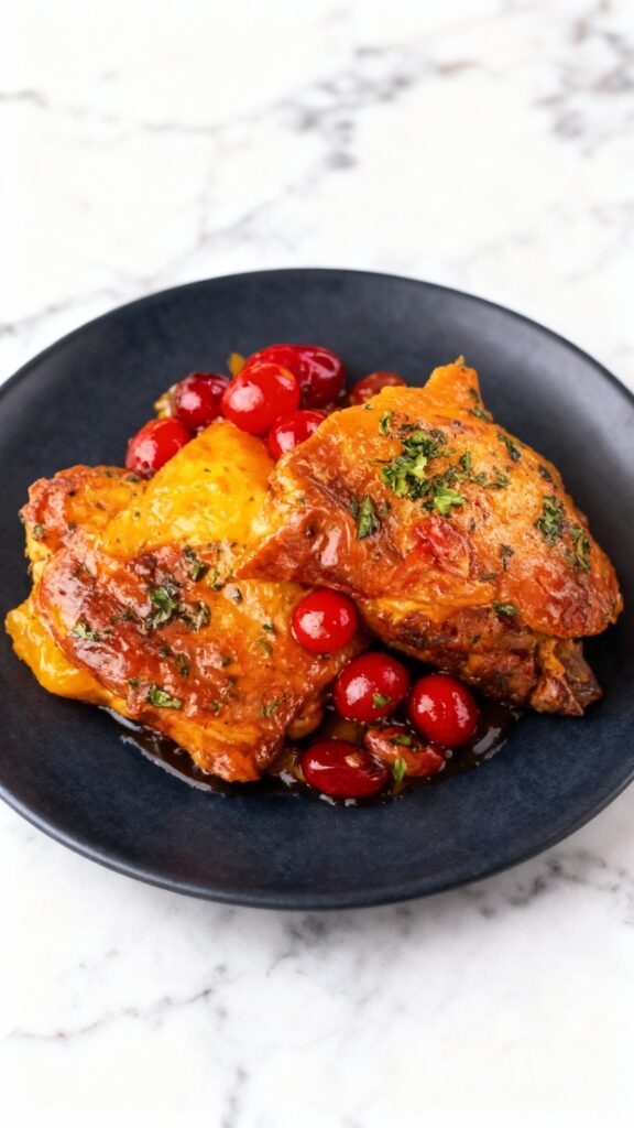 Transfer the seared chicken to a slow cooker, pour the sauce over, add cranberries, cover, and cook on low for 6 hours or high for 4 hours.