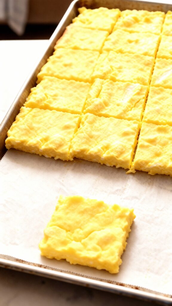 This sheet-pan method produces perfectly flat, uniform scrambled eggs that fit neatly onto sandwich rolls or English muffins.