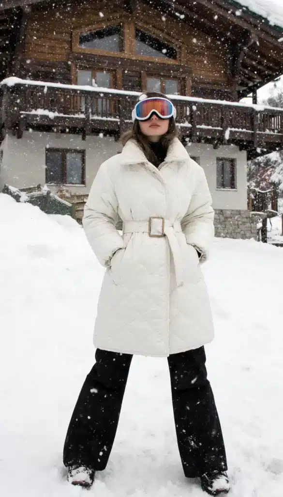 This one’s for the fashion-forward skier who *wants to be seen*. A belted quilted coat creates a feminine shape, while flared snow pants (yes, they exist) add some extra flair. Glam goggles complete the luxe snow queen aesthetic. Wear it for your Aspen trip or mountain-town strut. 💃