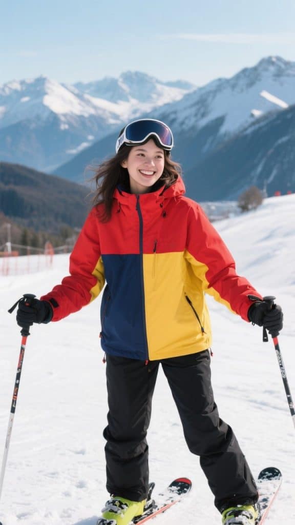 This combo is all about **visibility + fun**. The colorblock jacket pops against the snow (and in photos), while black snow pants balance it out and keep you warm + dry. It’s a great go-to for first-timers, group ski trips, or anyone who wants to look effortlessly cheerful in the snow. Bonus: it’s super easy to layer underneath thanks to the roomy fit.