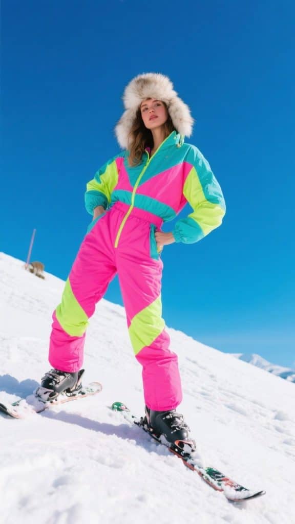 This one-piece wonder is a full vibe. It’s warm, waterproof, and serves *main character energy*. The neon color-blocking and faux fur hood give it that 80s glam feel, but it’s also super practical—no snow up your back, no adjusting mid-run. Wear it when you want to be seen (literally). Think: ski trips, music on the slopes, and lots of IG reels. 💖