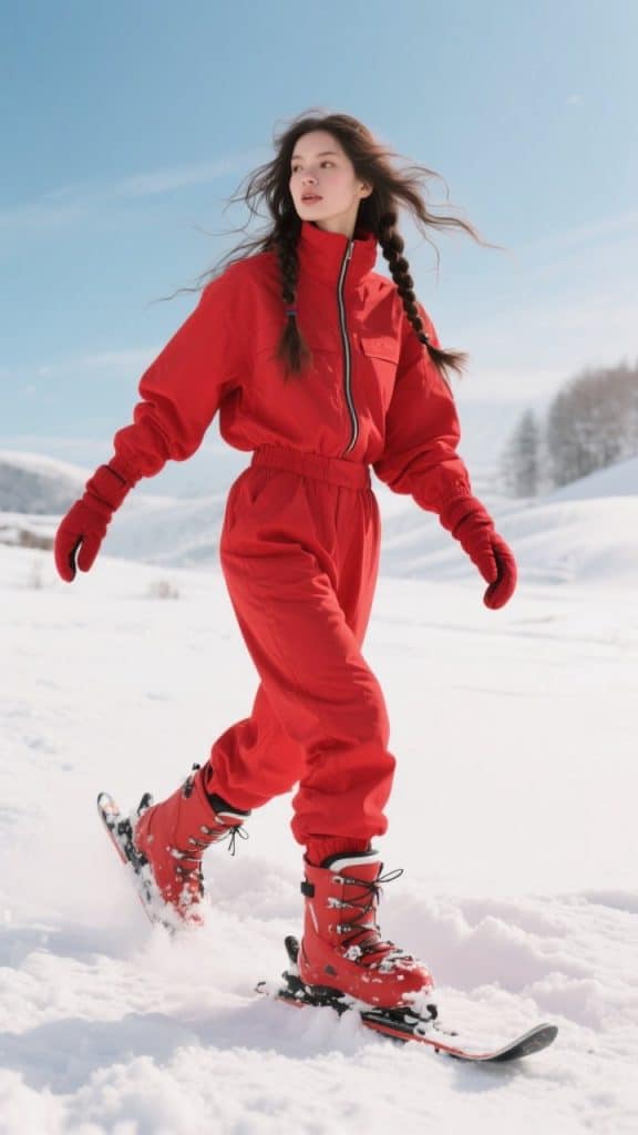 This look is built for the off-piste girlies. Whether you’re snowshoeing, hiking up a back trail, or just walking around a ski village, this insulated red utility suit has you covered—literally. It’s breathable but warm, functional but fashion-forward. And paired with snow boots or snowshoes? You’ll be unstoppable in deep powder. 🥾🏔️
