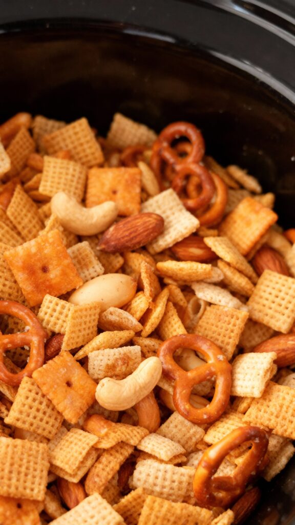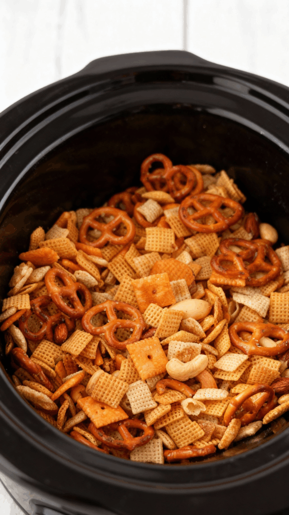 During the final hour, remove the lid to let the moisture escape — that’s how you get perfectly crisp Chex Mix without turning on the oven.