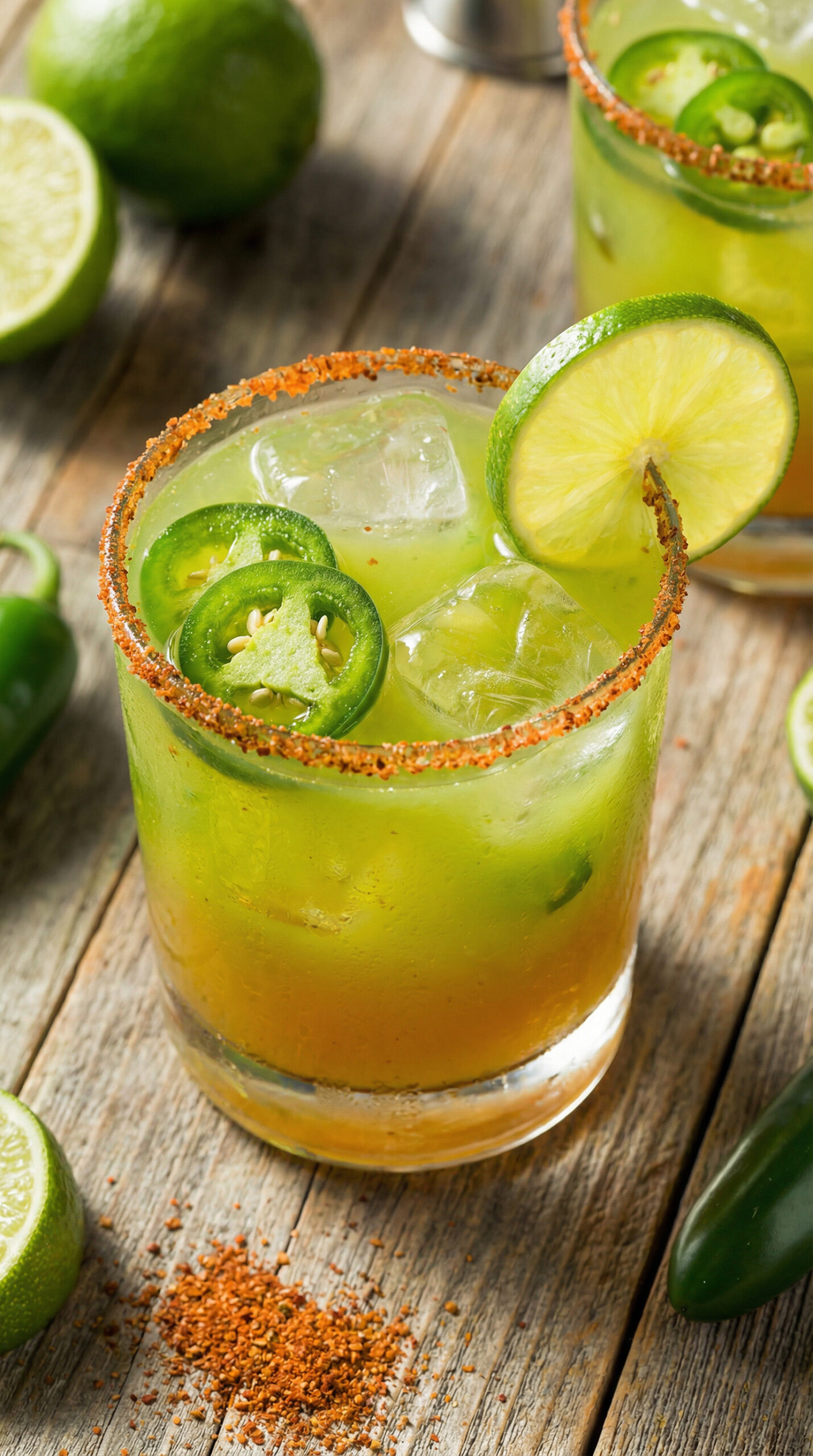 3. Chill and serve. Refrigerate for at least 30 minutes. Prepare glasses with spiced salt rim, fill with ice, and pour margarita over. Garnish each with a fresh jalapeño slice.