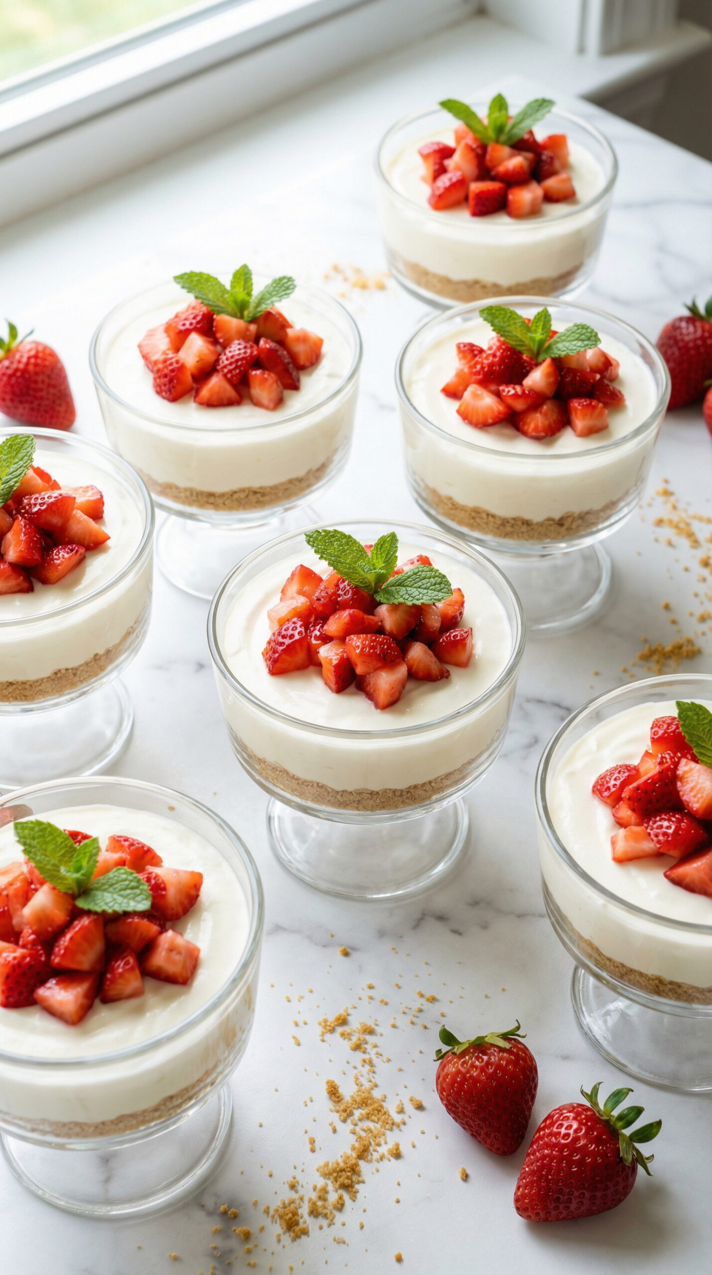 These no-bake cheesecake cups layer a buttery graham cracker crust with creamy cheesecake filling and fresh strawberry topping — all in individual portions that require zero oven time.
