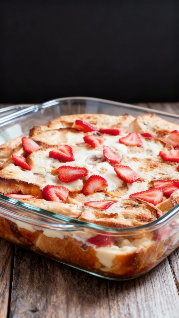 This make-ahead breakfast casserole layers cubed bread with sweetened cream cheese and fresh strawberries, all soaked in vanilla custard and baked until golden and puffy.