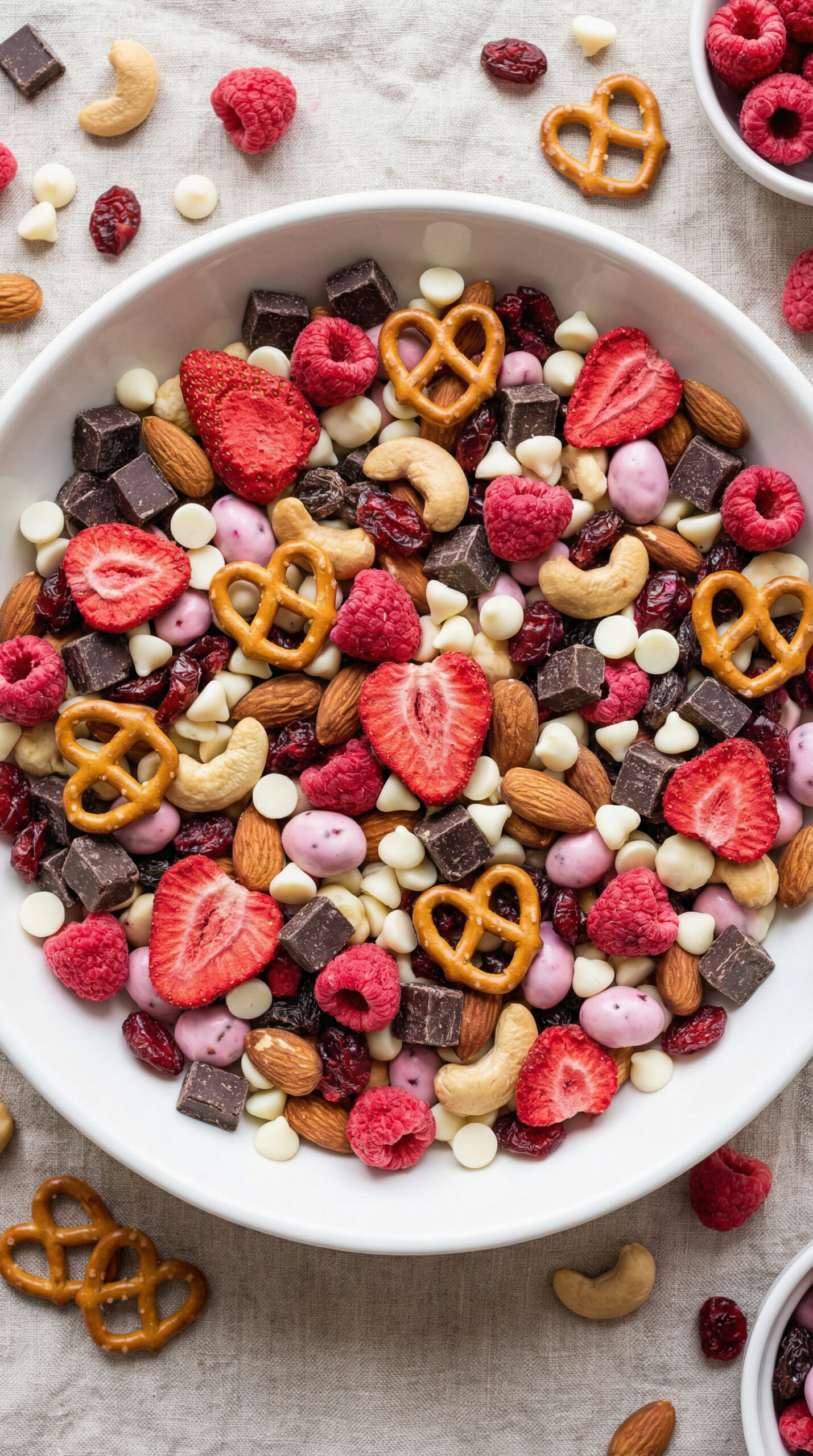 This sweet and salty trail mix combines dark chocolate, freeze-dried berries, and crunchy nuts in Valentine’s Day colors.