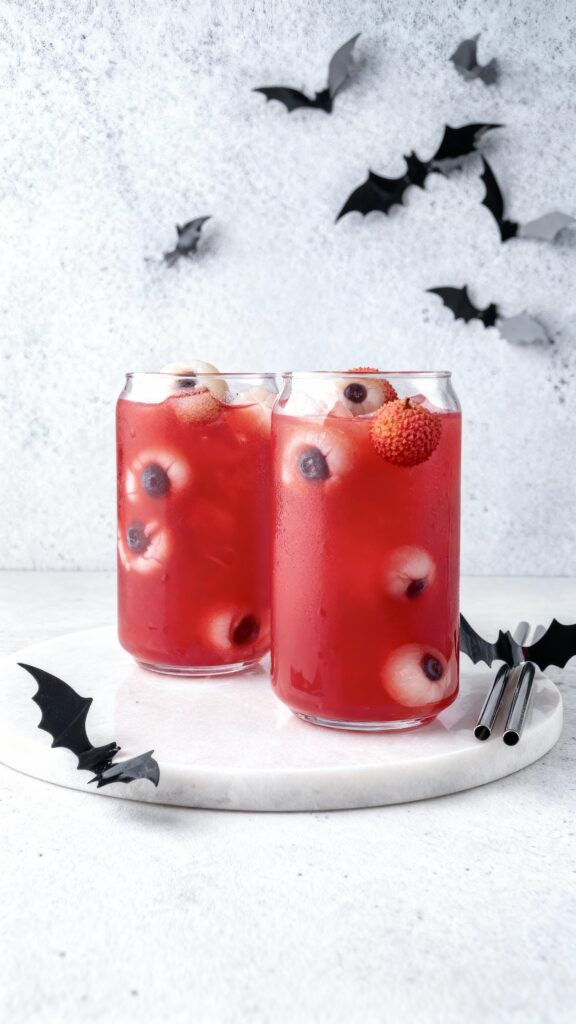 I love how the blood-red juice creates an eerie glow while the floating lychee “eyeballs” add a creepy-yet-delicious touch.