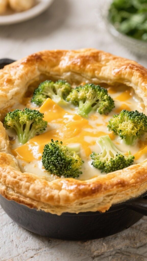 - Pour into dish, cover with pastry, bake at 400°F (200°C) for 20–25 minutes.