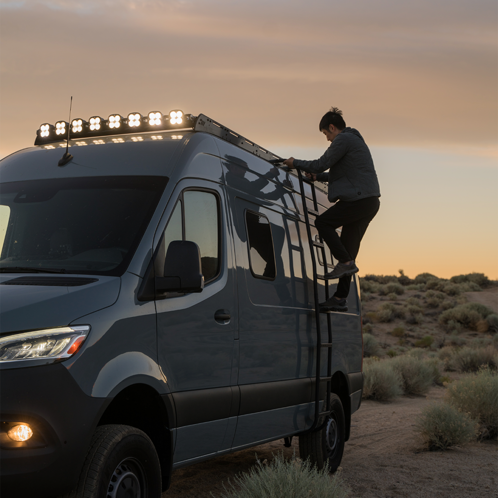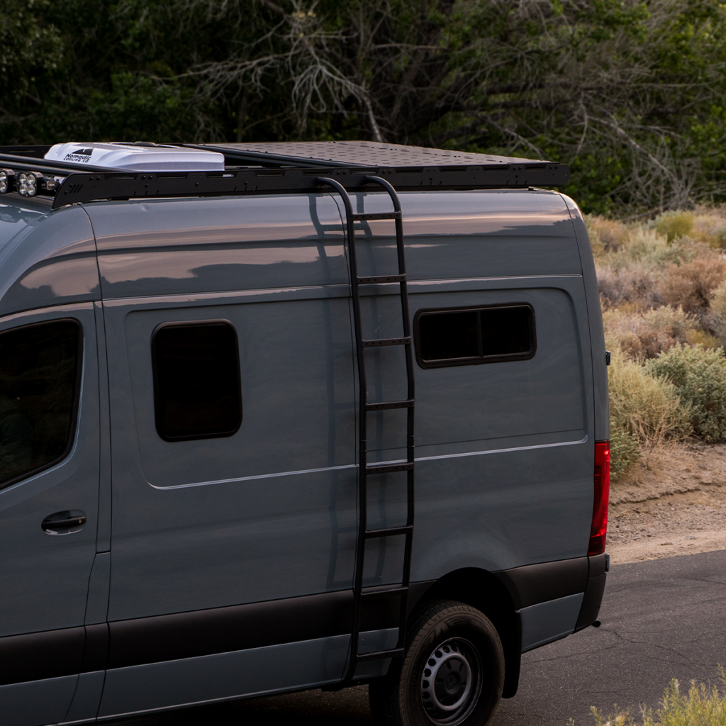 The Sprinter Side Ladder mounts securely along the driver’s side using factory mounting points. Built from powder-coated aluminum, it’s designed to integrate cleanly with the Strata roof rack system. Current price: $575.
