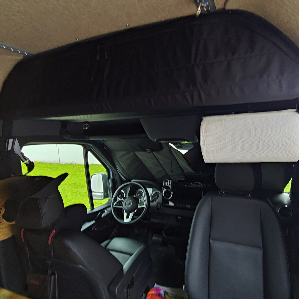 Mounted above the cab between the driver and passenger seats, the headliner shelf adds usable storage for bedding, window covers, or gear you want easy access to from the front. All-aluminum construction. Available starting at $299.