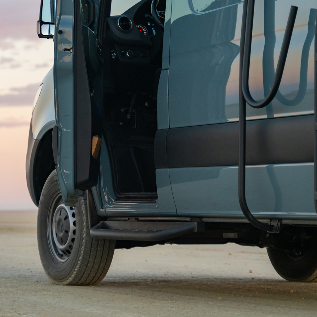 High-roof Sprinters sit high off the ground, which can make entry awkward. Side Steps bolt to the rocker panels to provide an intermediate step, while the Rear Tube Step mounts below the rear doors for easier cargo loading. Both are built from powder-coated aluminum.