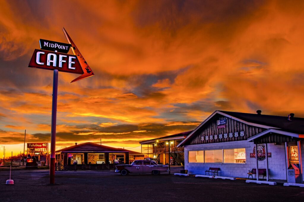 That makes this cafe the mathematical midpoint of Route 66, and they lean into it hard.